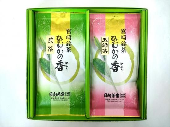 ひむかの香り玉緑茶とひむかの香り煎茶各100gがセットになった当店おすすめ人気ギフト商品です。